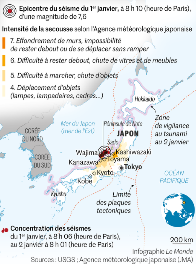 Ce séisme est le premier à causer la mort de plus de 100 personnes au Japon depuis le tremblement de terre ravageur de Kumamoto (Sud-Ouest) qui a fait 276 morts en 2016. Situé sur la « ceinture de feu » du Pacifique, le Japon est l’un des pays où les tremblements de terre sont les plus fréquents.