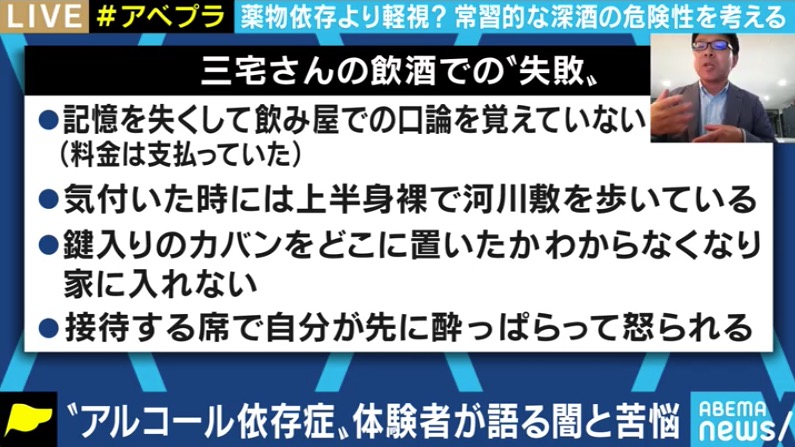 厚生労働省によると、「アルコール依存」とは、酒を長期間大量に飲み続けることでお酒がないといられなくなる状態に陥る病気で、国内の患者数は80万人以上、予備軍を含めると約440万人と推定されている。 依存症問題に詳しい精神保健福祉士・社会福祉士の斉藤章佳氏によれば、「飲んでいる時の自分は楽しい人間だと思う」「飲んで記憶をなくすことがある」「飲んで目的地にたどり着けないことがある」「飲んでケガをしたことがある」「今日は飲まない、途中でやめる、ができない」「飲まないと眠れない」「飲み会の翌日、皆の態度が冷たい」「『飲まなければいい人なのに』と言われる」といった点に心当たりのある人は、その予備軍に入る可能性があるのだという。(斉藤章佳『しくじらない飲み方 酒に逃げずに生きるには』より)。 「周りが“依存症かもしれない、何らかの治療を受けた方がいいのではないか”促しても、本人はなかなか受け入れられない。自分でも問題だとわかってはいるが、お酒を断つのは避けたいという思いから、その問題を過小評価してしまう」。