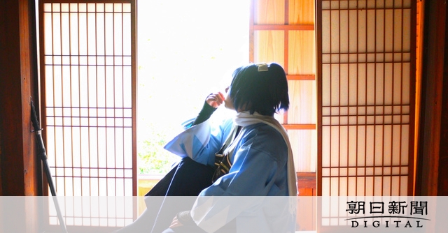 県指定文化財の一つ「旧前坊家住宅」の渡り廊下を見上げると、青いウィッグを着け、「誠」の文字が入った水色の羽織姿のコスプレイヤーがいた。