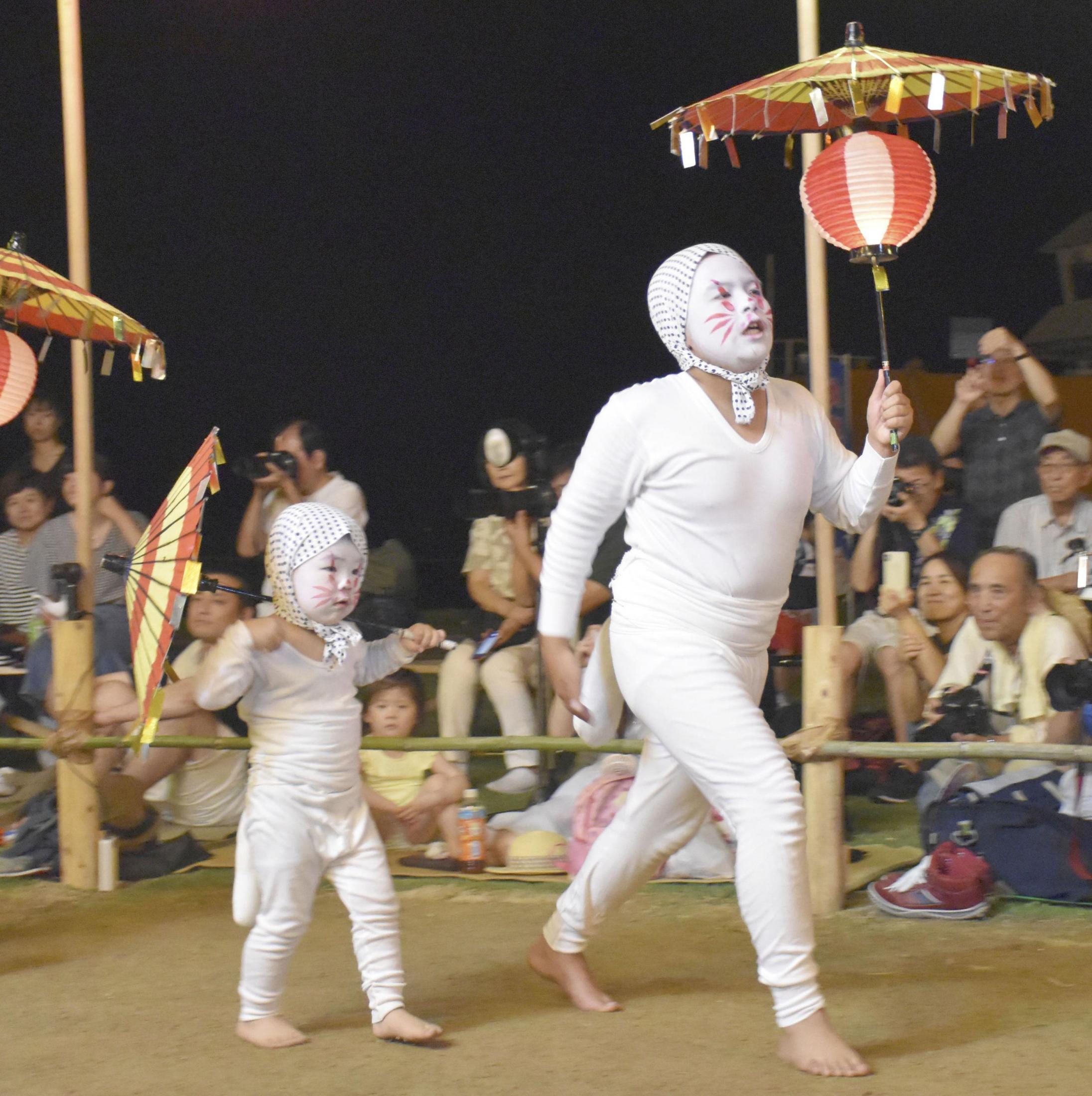 キツネ踊りを舞うのは白く塗った顔に赤いひげを描き、尻尾の付いた白い衣装をまとった幼児や小中学生の男の子約20人。輪になって軽やかに跳びはねるなど踊りを披露すると、観客から拍手と歓声が上がった。