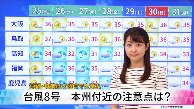 その他の地域も、今週は台風の間接的な影響をうけますので、注意が必要です。 台風8号は強い勢力を保ったまま、きょう24日(月)の夕方から夜にかけて奄美地方に最も接近する見込みです。