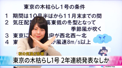 今年も東京の木枯らし1号の発表がない可能性が高くなっています。2年連続で発表がないのは、統計開始以来はじめてのことです。これには、昨年も今年も秋の気温が高かったことが関係しています。