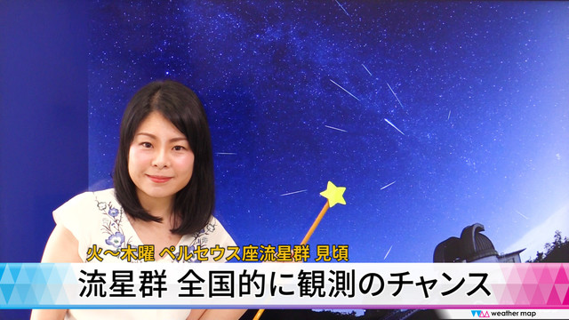 火曜日から木曜日の夜はペルセウス座流星群が見頃となります。全国的に観測のチャンスがあるでしょう。 月曜日にかけては東北や九州、沖縄で荒れた天気になる所がありますが、その他は晴れるでしょう。火曜日以降は、全国的に山沿いは雨や雷雨となりやすいものの、平野部は広い範囲で晴れて、星空が楽しめそうです。12日(水)の夜には、ペルセウス座流星群が極大となり、その前後を含む11日(火)~13日(木)は、より多くの流星が見られるため、見頃となります。 ペルセウス座流星群は、三大流星群の一つで、年間でも1,2を争う流星数を誇ります。