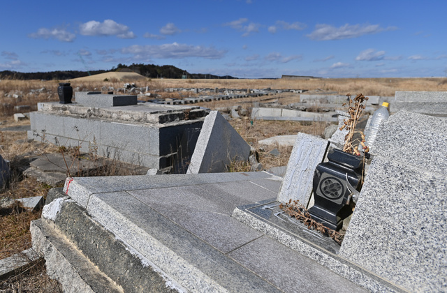 津波の被害に遭った双葉町の中浜共同墓地。崩れたお墓にも、花が供えられた跡が残る=2021年2月5日、福島県双葉町、福留庸友撮影