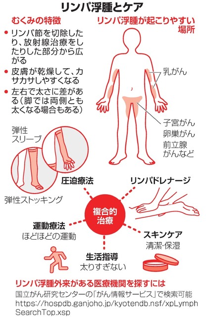 がんの手術でリンパ節を取り除くと、後になって腕や脚などがむくむリンパ浮腫の症状が出ることがある。確実な予防法や治療法はないものの、スキンケアや生活指導などを組み合わせた「複合的治療」をすると、苦痛を減らして日常生活を送れるようになってきている。