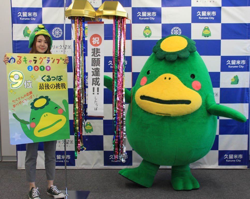 背水の陣が見事に結実-。福岡県久留米市のイメージキャラクター「くるっぱ」が「ゆるキャラグランプリ(GP)」で9位になり、挑戦7回目で悲願のトップ10入りを果たした。