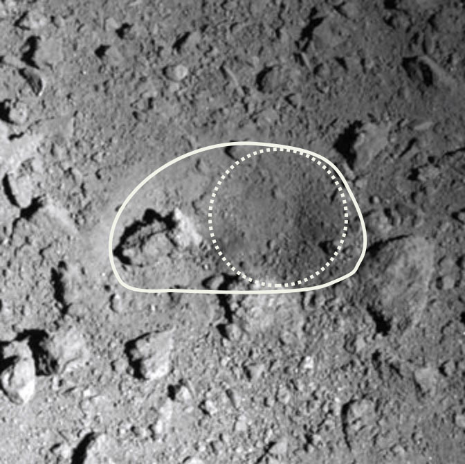 クレーターの範囲はこれまで、金属弾に直接当たってできたとみられるきれいな円形部分を指すのか、2次的に陥没したくぼみを含めた半円形の範囲を指すのか、JAXA内部で半年にわたり議論が続き、確定していなかった。今回は世界初のケースのため、はやぶさ2チームが独自に決めた。