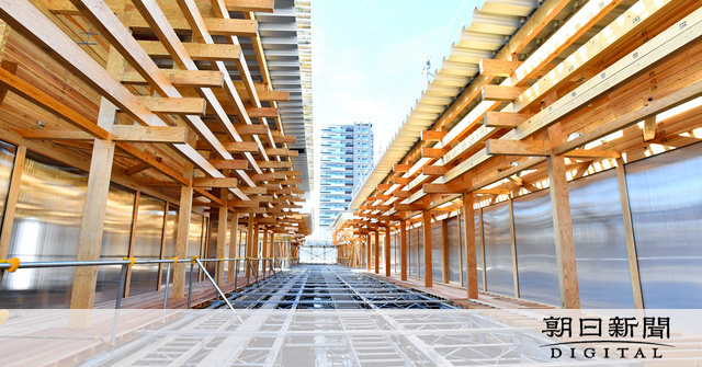 東京五輪・パラリンピックの選手村(東京都中央区晴海4丁目)で、チームの歓迎式典などで使われるビレッジプラザが29日、報道陣に初めて公開された。大会組織委員会によると、4月に完成する予定という。