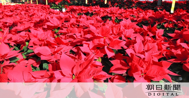クリスマスを彩る観葉植物ポインセチアの出荷が、最盛期を迎えている。熊本県山鹿市のチブサン洋花園のビニールハウスでは、出番を待つポインセチアがずらりと並び、赤と緑のクリスマスカラーで埋め尽くされている。
