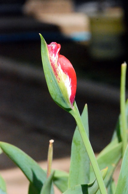 千葉市若葉区の田中邦宏さん(82)方の庭で、チューリップの花が枯れた後、葉の先端から赤い花びらが出てきた。