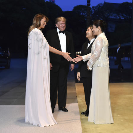 令和最初の国賓として来日中のトランプ米大統領を歓迎し、天皇、皇后両陛下が初めて主催する宮中晩さん会が27日夜、皇居・宮殿の「豊明殿」で開かれた。トランプ氏と天皇陛下は午後7時35分、並んで豊明殿に入場し着席。トランプ氏の右隣には皇后陛下、天皇陛下の左隣にはメラニア大統領夫人が着席した。