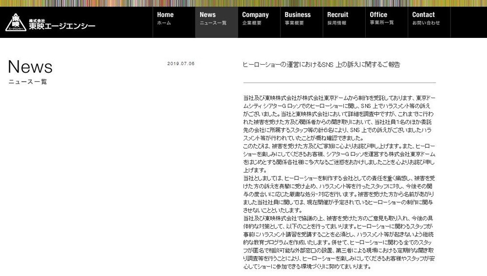 東京ドームシティ内の劇場「シアターGロッソ」で上演していたヒーローショーの出演者にセクハラが繰り返されていた問題で、同ショーを制作する東映エージエンシーと東映は2019年7月6日にセクハラの事実を認め、被害女性へも報告と謝罪を行った。