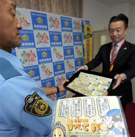 22日に同署で行われた受贈式で、高山敏一支社長は「私たちの仕事はお客さまを訪問することがベース。(今回の取り組みを通じて)皆さんのお役に立つことができれば」と力説。鯛(たい)取(とり)正人署長は「特殊詐欺対策は喫緊の課題。(同支社のような)団体の方々と協力しながら、被害防止に全力を尽くしたい」と述べた。