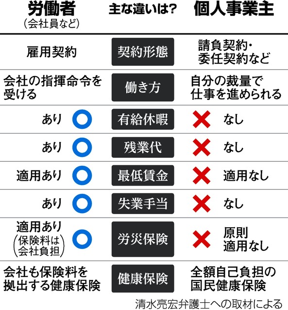 労働問題に詳しい弁護士や研究者は、働き方の多様化の中で、学習塾の講師や配達員、訪問販売員など様々な職業で今回の講師らのような「名ばかり事業主」は増えているとみる。だが厚生労働省にも統計がなく、実態は判然としない。今回のケースは、新型コロナウイルスで立場の弱さが浮き彫りになった個人事業主、人材確保を図りたい会社側双方にメリットとなりうるモデルの一つとして注目されそうだ。