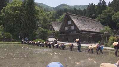 岐阜県白川村の世界遺産の合掌集落で27日、昔ながらの田植えの様子を再現した「田植え祭り」が行われました。