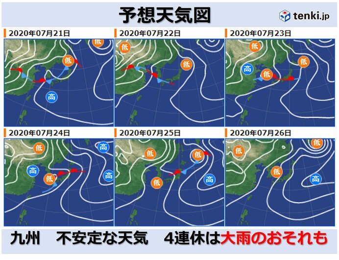 連休期間は雨の降り方に警戒が必要です。 きのう19日は九州北部地方の梅雨明けの平年日でしたが、今週も不安定な天気が続くため、九州の梅雨明けはさらに遅くなる見込みです。