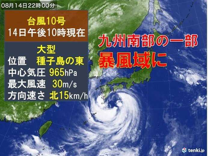 14日(水)午後10時現在、台風10号は種子島の東の海上を一時間に約15キロの速さで北に進んでいます。九州南部の一部が暴風域に入りました。