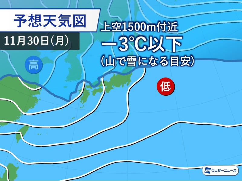 11月の気温は平年より高いところが多く、西日本や東日本では「長い秋」になっています。ただ、今週末28日(土)~30日(月)にかけて上空の強い寒気が南下し、全国的に初冬らしい寒さが訪れる見込みです。 28日(土)以降、平地でも雪を降らせる目安のー6℃(上空1,500m)の強い寒気が東北北部まで南下。山沿いを中心に雪を降らせるー3℃の寒気は北陸や東北南部、中国地方の一部を覆います。 西高東低の気圧配置となって、北海道や東北北部では平野部でも雪が降りやすくなる予想です。 東北南部や北陸信越では山沿いを中心に雪が降り、沿岸部では局地的に激しい雷雨になるおそれがあります。ー3℃線がかかる中国山地でも標高の高いエリアでは一時的に雪が降る可能性があります。 北海道や東北北部では雪への備えを万全にしてください。東北南部や北陸・中国地方でも峠道を走る場合は冬タイヤを装着しておくと安心です。