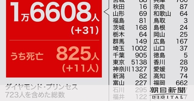新型コロナウイルスの国内の感染者数は23日午後8時現在で、新たに31人が確認され、累計で1万6608人となった。緊急事態宣言が続く東京は2人で、宣言が出された4月7日以降の最少人数を2日連続で更新。同じく宣言下の千葉は4日ぶりに感染者は0人となった。