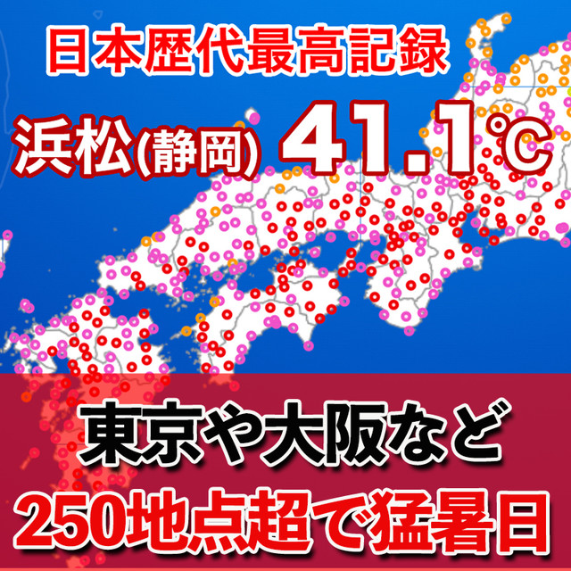 今日17日(月)も西日本から東日本の広い範囲で酷暑が続いています。静岡県浜松市では日本歴代最高に並ぶ41.1℃を観測しました。