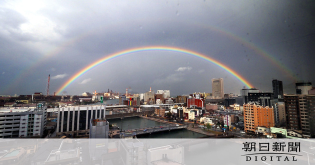 上空に寒気が流れ込んだ影響で小雨が降っていた10日午後、北九州市のJR小倉駅そばの紫川の河口に二重の虹がかかった。