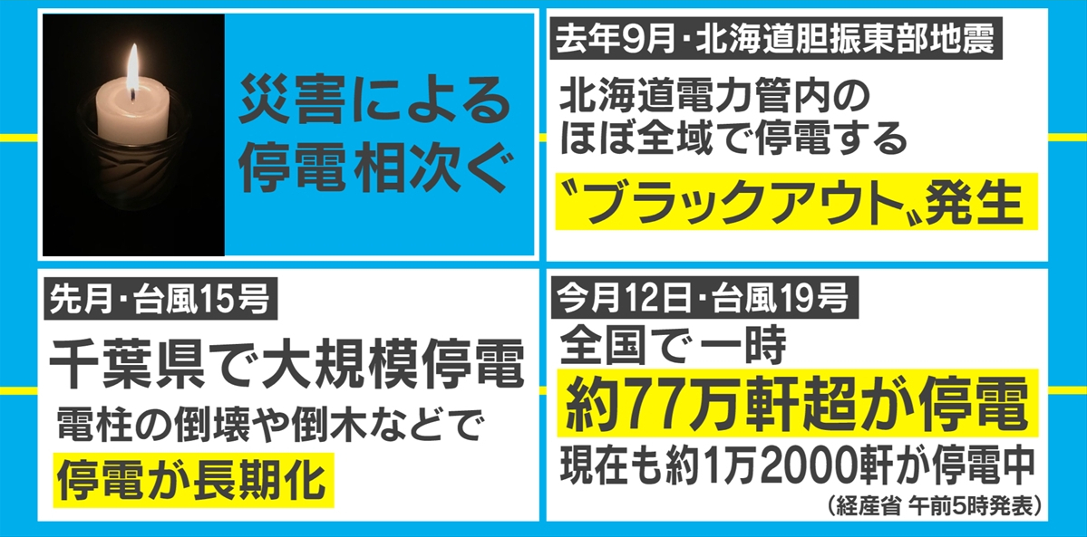 9月の台風15号では千葉県で大規模停電が発生し、また先日の台風19号でも全国で一時77万軒超が停電するなど、最近では災害による停電の被害が相次いでいる。