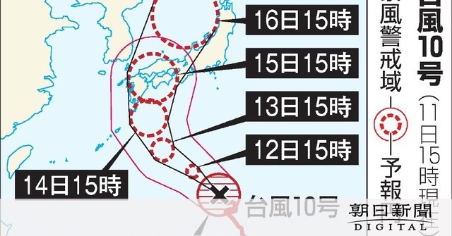 大型で強い台風10号は11日午後、小笠原諸島の南西の海上をゆっくりと北西へ進んだ。このまま北上を続け、15日ごろに西日本に接近、上陸する恐れがある。東日本や西日本の太平洋側は、12日夜からうねりを伴った大しけとなる見込み。気象庁は、高波や土砂災害、河川の増水などへの警戒を呼びかけている。