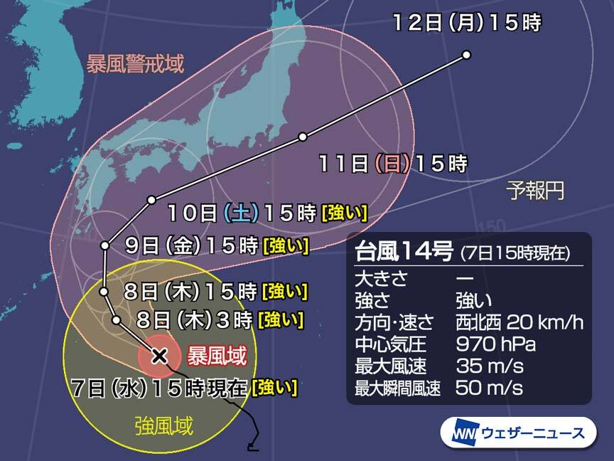 7日(水)15時現在、台風14号(チャンホン)は「強い」勢力となって日本の南の海上を西北西に進んでいます。 このあとも台風は海面水温の高いエリアを進むため、勢力をさらに少しずつ強めながら北上し、明日朝に大東島地方に最も近づく予想です。 ▼台風14号 10月7日(水)15時