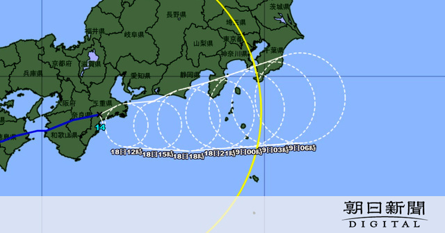 気象庁によると、台風14号は18日午前8時現在、三重県尾鷲市付近にあり、中心気圧は996ヘクトパスカル、中心付近の最大風速は20メートル、最大瞬間風速30メートル。18日夜には東海の太平洋沖で温帯低気圧に変わり、19日にかけて伊豆諸島付近を通過する見込み。