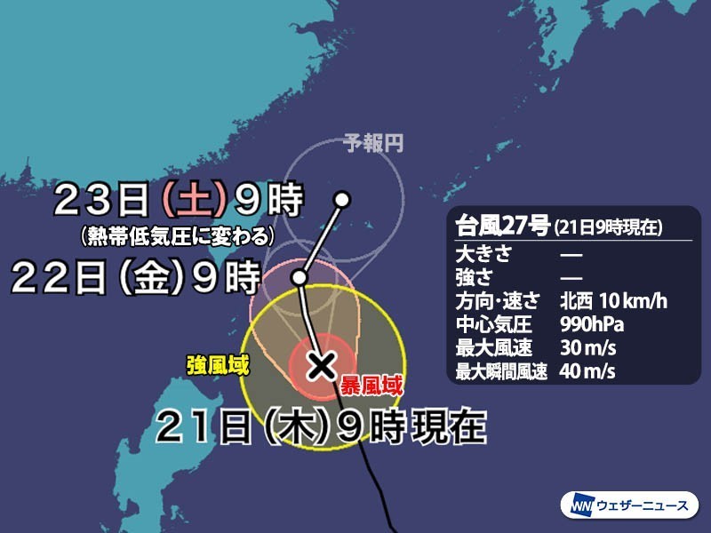 21日(木)9時、台風27号(フォンウォン)は沖縄の南の海上を進んでいて、中心付近の最大風速が30m/sに達して暴風域を伴うようになりました。
