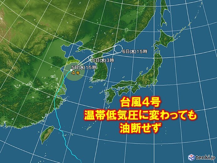 台風4号は、6日(木)には日本海で温帯低気圧に変わりますが、油断できません。低気圧に変わったあと、再発達し、北海道付近に近づくでしょう。