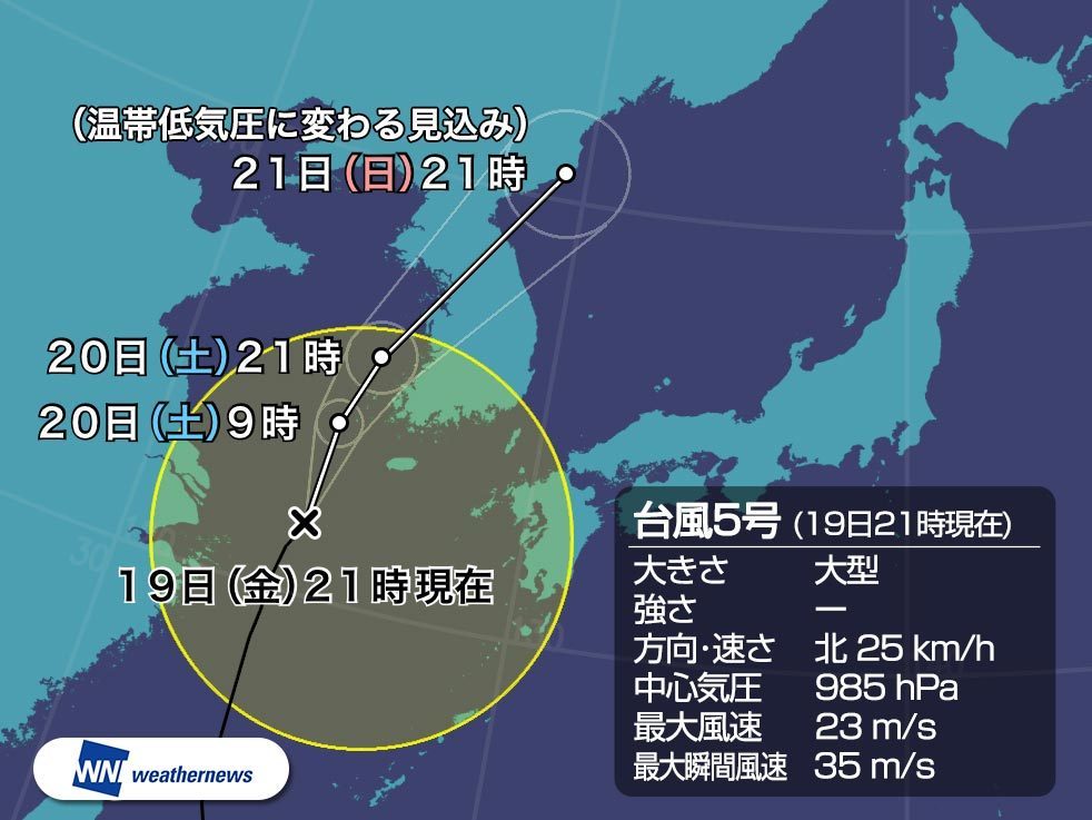 7月19日(金)21時現在、大型の台風5号(ダナス)は東シナ海を北上しています。九州の大部分が、風速15m/s以上の強風域に入っています。台風は今後も勢力を維持して黄海を北上し、朝鮮半島に上陸して衰弱する見込みです。