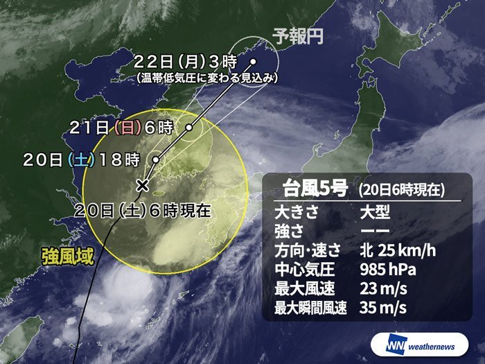 20日(土)6時現在、大型の台風5号(ダナス)は黄海を北上しています。九州の全域や中国四国地方の一部が、風速15m/s以上の強風域に入っています。