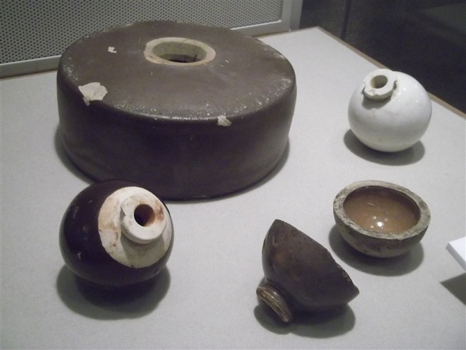 手榴弾や地雷などの軍需品が陶器で作られるようになったのは、戦況が悪化し、国土が爆撃機などの空襲にさらされ本土決戦が現実味を帯びてきたころから。全国の陶磁器の産地で生産された陶製の容器が軍需工場に集められ、爆薬を詰め信管などを取り付けて製品化された。金属の製品に比べると殺傷能力は低かったようだ。 写真の手榴弾と地雷は、埼玉県川越市にあった浅野カーリット埼玉工場に集められ戦後不要となった陶製容器が、粉々にされ工場近くの河川敷に投棄されていたものである。 (嘉麻市碓井平和祈念館学芸員 青山英子) ■ 嘉麻市碓井平和祈念館が収蔵する戦争資料を学芸員の青山英子さんが紹介します。