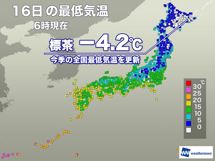 昨日から上空にこの時期としては強い寒気が流れ込み、今日16日(金)朝も北日本を中心に冷え込みが強まりました。