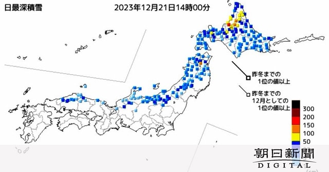 気象庁によると、21日午後2時までの24時間で降った雪の量は、北海道苫前町31センチ、青森市12センチ、新潟県阿賀町20センチ、岐阜県白川村42センチ、広島県北広島町41センチなど。そのほか九州北部でも雪が降り、大阪では初雪が観測された。