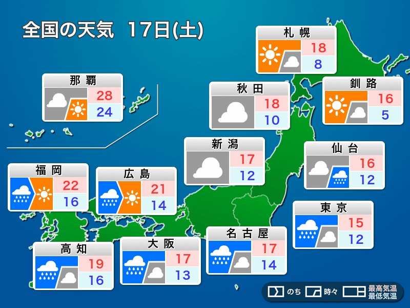 明日17日(土)は本州の南海上に前線が伸びて、西日本や東日本では太平洋側を中心に雨が降ります。日中、西から段々止んできますが、関東では終日雨で、気温がほとんど上がらず、昼間でも15℃に届きません。