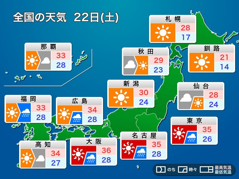 明日22日(土)は、太平洋高気圧の勢力はやや衰えて、四国沖には低気圧が進んできます。