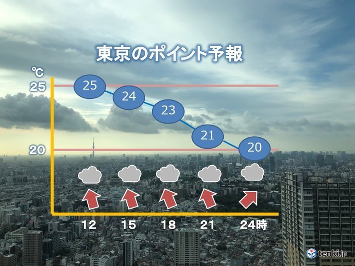 日中も、湿った空気が流れ込むため、雲が広がりやすいでしょう。ただ、東京都心では雨の降る確率は低く、降水確率は夜にかけて10%となっています。スッキリしない天気ですが、雲の隙間から青空の見える時間帯もあるでしょう。