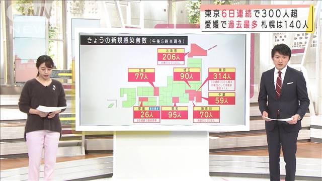 連休最終日の23日も各地で多くの感染者が確認されています。主な地域の感染状況です。 東京は314人と6日連続で300人を超えました。月曜日というのは主に週末の検査の結果が反映されるので感染者が少ない傾向にあるのですが、300人を超えたのは初めてです。重症の患者は前の日から1人増えて41人となりました。そのほか、午後5時半時点で千葉は59人、埼玉は90人、神奈川は70人。そのうち横浜市だけで35人の感染が確認されています。愛知で95人、兵庫で77人、愛媛で26人となり、3日連続で最多を更新しています。そして、北海道が206人。「GoToトラベル」の見直しを受けて割り引きの対象外になる方針の札幌市では140人の感染が確認されています。