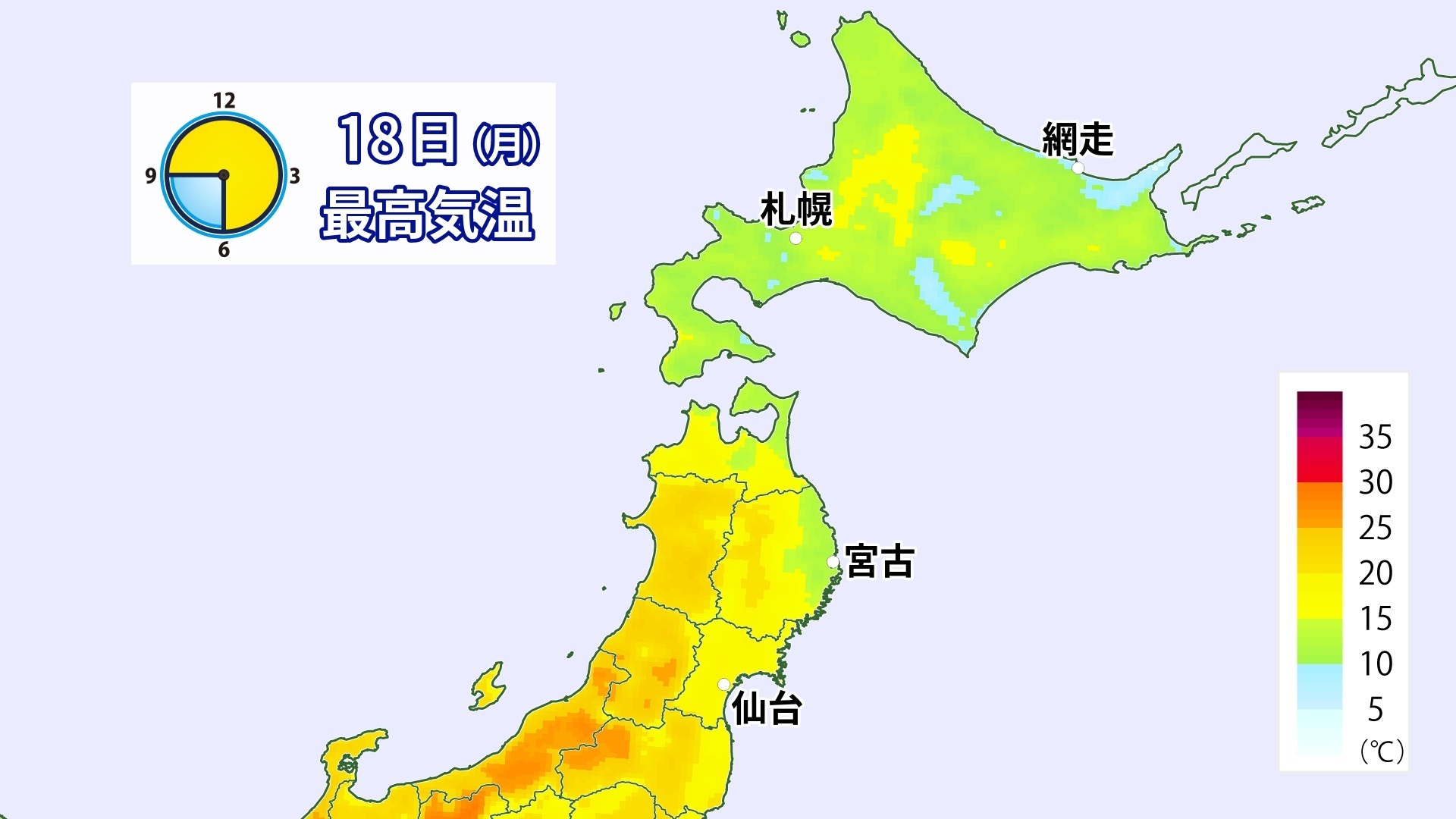 きょう18日(月)昼、北海道オホーツク海側や東北北部に「低温注意報」の発表されている地域がある。冷たい空気の影響で、予想最高気温は網走で8℃(平年差-7℃)、岩手県宮古で13℃(平年差-5℃)までしか上がらない見込み。