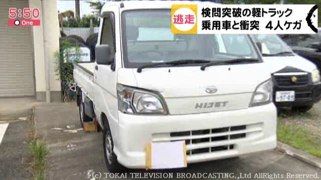 愛知県半田市で13日未明、検問から逃走した軽トラックが乗用車に衝突し、男性4人が軽いケガをしました。