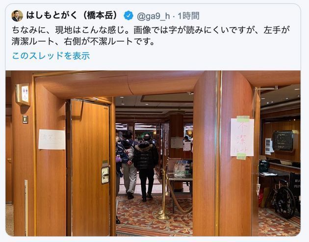 新型コロナウイルスの集団感染が発生したダイヤモンド・プリンセス号の対応に当たっている橋本岳・厚生労働副大臣が2月20日、船内に「不潔ルート」と張り紙されたスペースがあることを示す写真をTwitterに投稿した。写真は、まもなく削除された。(ハフポスト日本版・安藤健二)