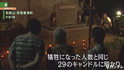 午前1時、那智勝浦町の井関地区では、水害が発生した時間に合わせて、犠牲になった人数と同じ29のキャンドルに明かりが灯されました。