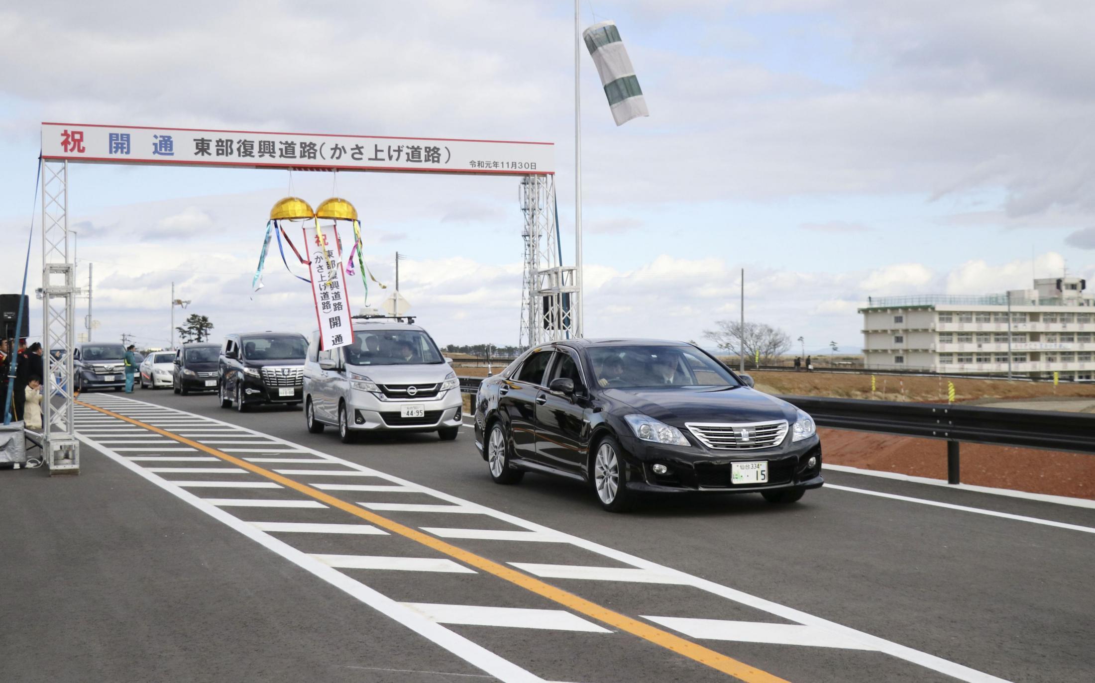 東日本大震災で被災した仙台市に、堤防機能を持つ全長10.2キロの「東部復興道路」が30日、全線開通した。高さ約6メートルの盛り土構造で、市沿岸部をほぼカバーするように海岸から約1キロを南北に縦断する。海岸、河川に整備された堤防とともに津波から町を守る。