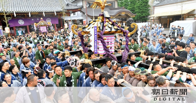 東京に初夏の訪れを告げる浅草神社(台東区)の三社祭は19日、最終日を迎え、3基の本社神輿(みこし)を境内から担ぎ出す「宮出し」があった。