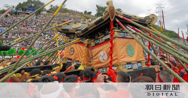 締め込み姿の男たちが3基の神輿(みこし)を激しくぶつけ合う「神輿合わせ」は、神社から西に約1キロ離れた御旅山(おたびやま)のふもとの広場で行われた。「ドスン」という大きな音とともに土煙が上がると、広場を取り囲んだ大勢の見物客から、歓声と拍手が上がった。その後、豪華な装飾の「屋台」を複数寄せ合って力を比べる「練り合わせ」もあり、会場は熱気に包まれた。(西岡臣)