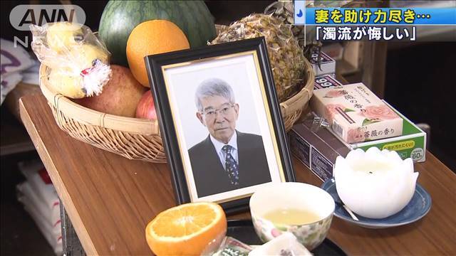 井上三郎さんは4日朝、球磨川の氾濫に気付いて妻の節子さんと避難するため、自宅を出ました。しかし、水は胸の高さに達していて流れも早く、身動きが取れないため、向かいに住む男性に救助を求めました。渡されたロープを井上さんが節子さんに巻き付け、節子さんは救助されました。次に井上さんがロープをつかみましたが、濁流にのまれて流されてしまいました。遺体は300メートル先で見つかったということです。