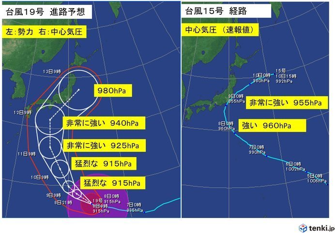 先月、首都圏に大きな被害をもたらした台風15号が関東に接近した際の9日0時には非常に強い勢力で、中心気圧は955hPaでした(速報値)。今回の台風19号が日本の南に進んでくると予想される12日(土)午前9時の勢力は非常に強いで、中心気圧は940hPaと低く、台風15号を上回る勢力で関東や東海に近づく可能性があります。
