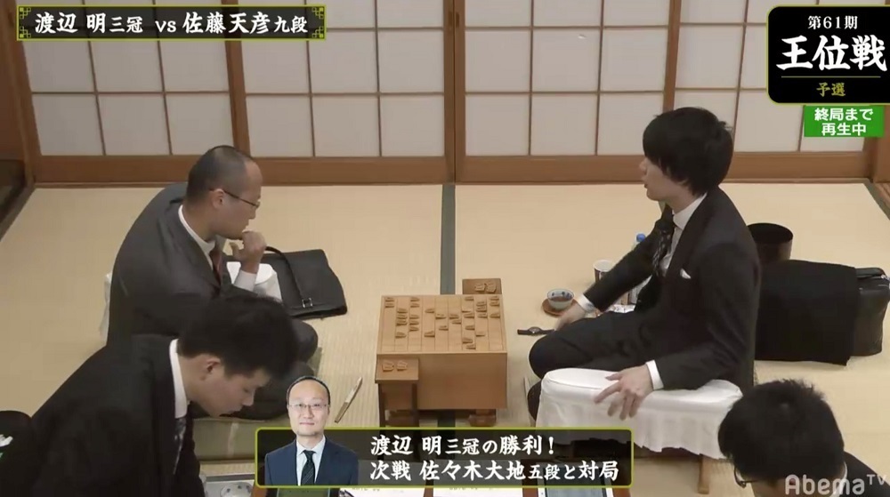 棋王・王将・棋聖と3つのタイトルを保持する渡辺三冠は、前名人の佐藤九段に対して、本局でも圧倒。相掛かりの出だしから確実にペースを握り、そのまま揺るがず押し切った。